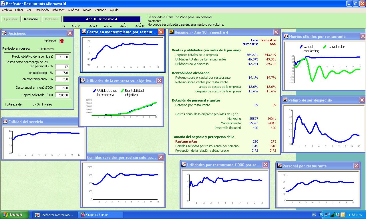 El equipo uno coordinado correctamente, estaba llegando a un buen negocio con los resultados del simulador, pero una erronea decisión: "Subele al marketing" les hizo caer en su primer despido!.. pero se volvieron a leventar, hasta caer en elo mismo.. je,je. Realmente todos participaron, todos ponian su mayor atención a las variables que el simulador les arrojaba.